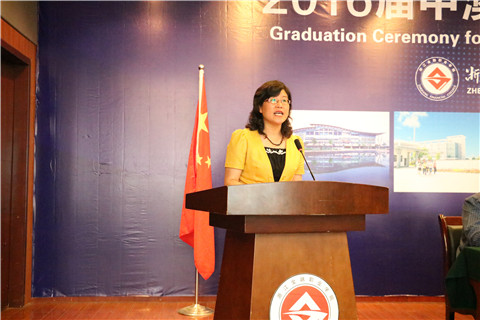 方华代表学院向全体毕业生致辞。她向全体毕业生表示热烈祝贺,祝贺同学们凭借着自己的毅力,完成了中澳双方繁重的课程,顺利毕业,取得了中澳文凭、证书,获得了巨大的成长和进步。她向家长、老师和同学表示衷心的感谢。她向同学们提出了三点希望:一是心中有梦想、二是脸上有微笑、三是手上有技能,希望未来同学们中间能涌现多个“技能标兵”、产生多个“理财神手”。方华祝福各位同学从此拥有更加美好的未来、拥有更加幸福的人生!