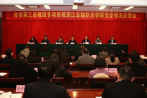 根据省委巡视工作领导小组的部署,2018年3月21日下午,省委第三巡视组向浙江金融职业学院党委反馈专项巡视情况。省委第三巡视组组长徐定安主持向浙江金融职业学院党委书记周建松的反馈会议并反馈了专项巡视情况,省委巡视工作领导小组办公室副主任邱志明传达了省委书记车俊关于巡视工作的重要讲话精神。之后,徐定安代表省委巡视组向浙江金融职业学院党委领导班子进行了反馈,邱志明对党委抓好巡视整改工作提出要求,省委教育工委副书记、省教育厅副厅长陈根芳、省委第三巡视组副组长卢秀芝、徐超光参加反馈会议。周建松主持会议并作表态发言。