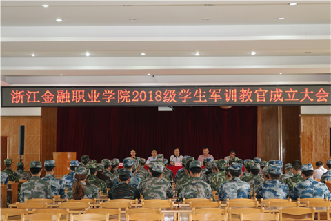 9月12日,浙江金融职业学院2018级学生军训教官成立大会在诚信讲学堂隆重举行。学校副校长郭福春、军训团团长、政委、参谋长、政治工作部主任及全体军训教官出席大会。