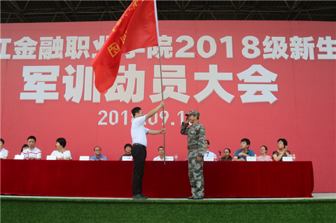学校副校长郭福春为2018级军训团团长黄中梁上校授予“浙江金融职业学院军训团”旗帜。军训团司令部参谋长翁惠根宣布2018级军训工作领导小组及军训团团部成员名单。