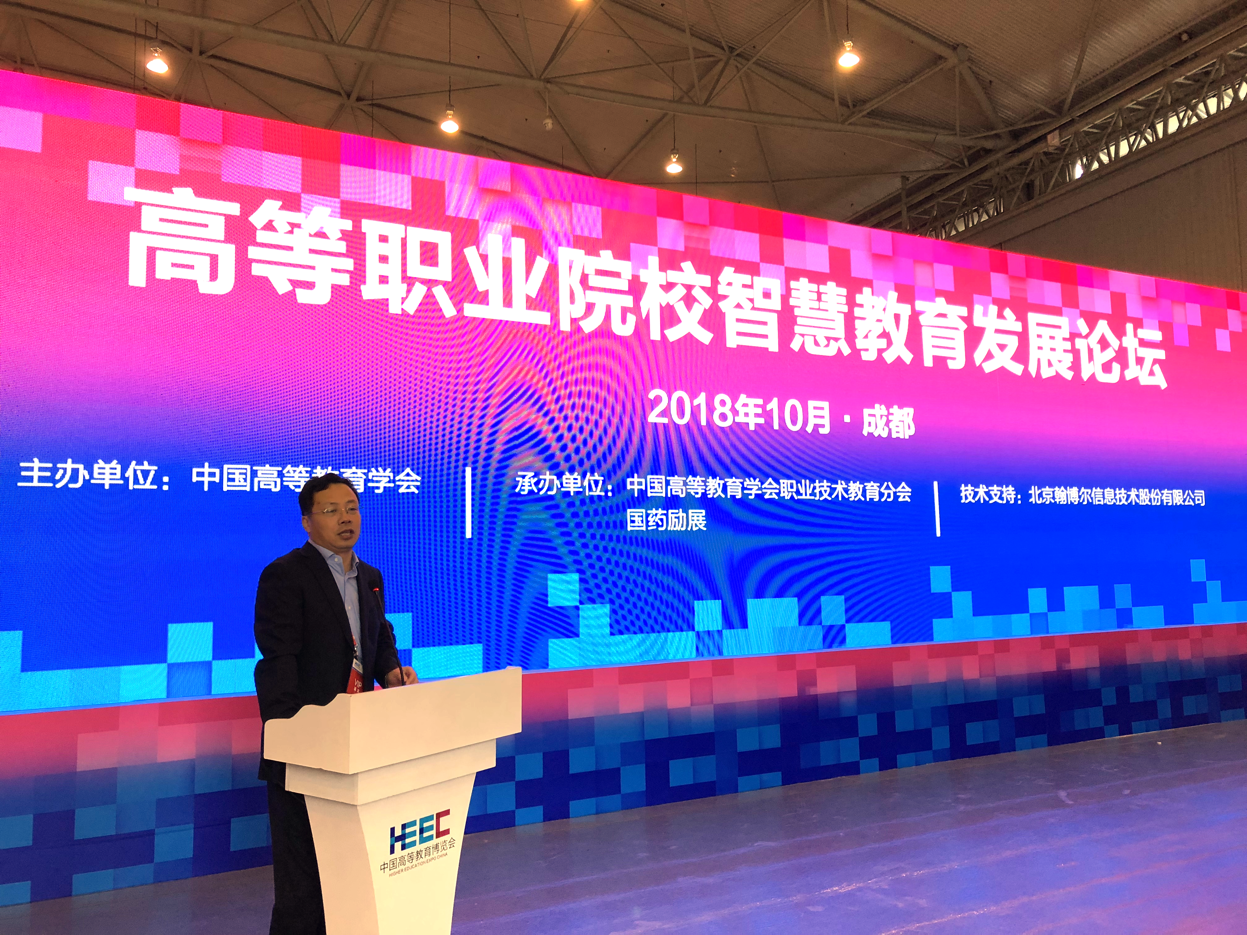10月20日上午,主论坛在成都国际会展中心举行,会议由郭福春副校长主持。同日下午,实验实训与教育技术装备、产教融合等分论坛分别举行。中国高等教育学会副秘书长王小梅,中国高等教育学会职业技术教育分会副理事长、成都航空职业技术学院院长张蕴启出席论坛并致辞。