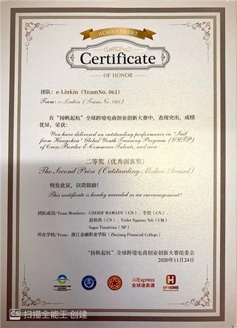 11月24日,2020年“扬帆起杭”全球跨境电商创新创业大赛在杭州洲际酒店隆重举行。由我校留学生CHERIF MAMADY、VIOLET NGANWO NDI、SAGAR TIMALSINA和中国学生李倩、俞颖燕组成的e-Linkin国际团队在国际商学院张帆、金方增老师的指导和帮助下,在247支队伍中脱颖而出,凭借“跨境电商直播达人孵化”项目成功进入全国总决赛,并获得二等奖(优秀创客奖)的佳绩,获奖金5000元。