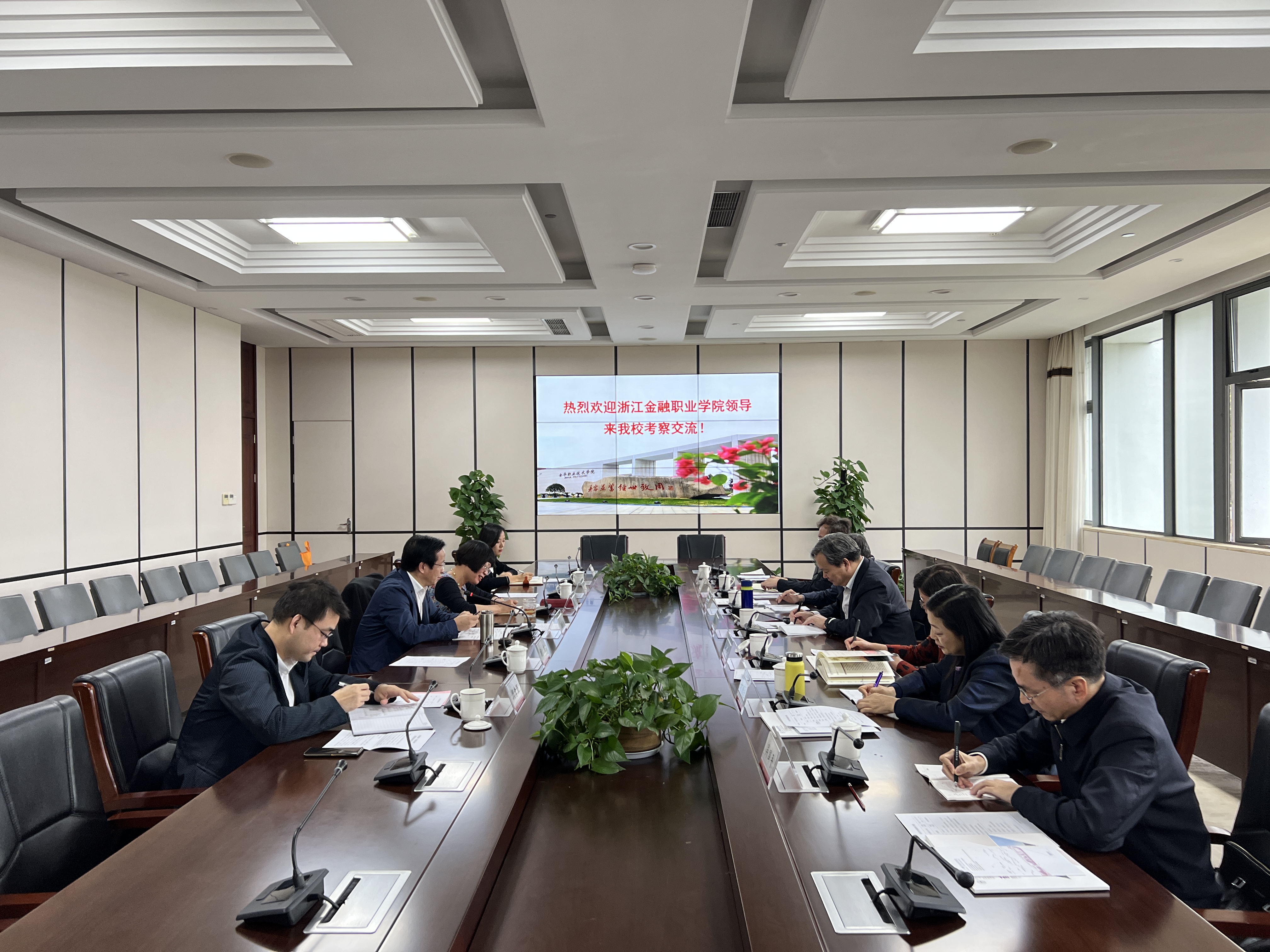 金华职业技术学院党委书记王振洪、院长梁克东、副院长成军热情接待了周建松一行并参加座谈交流会。