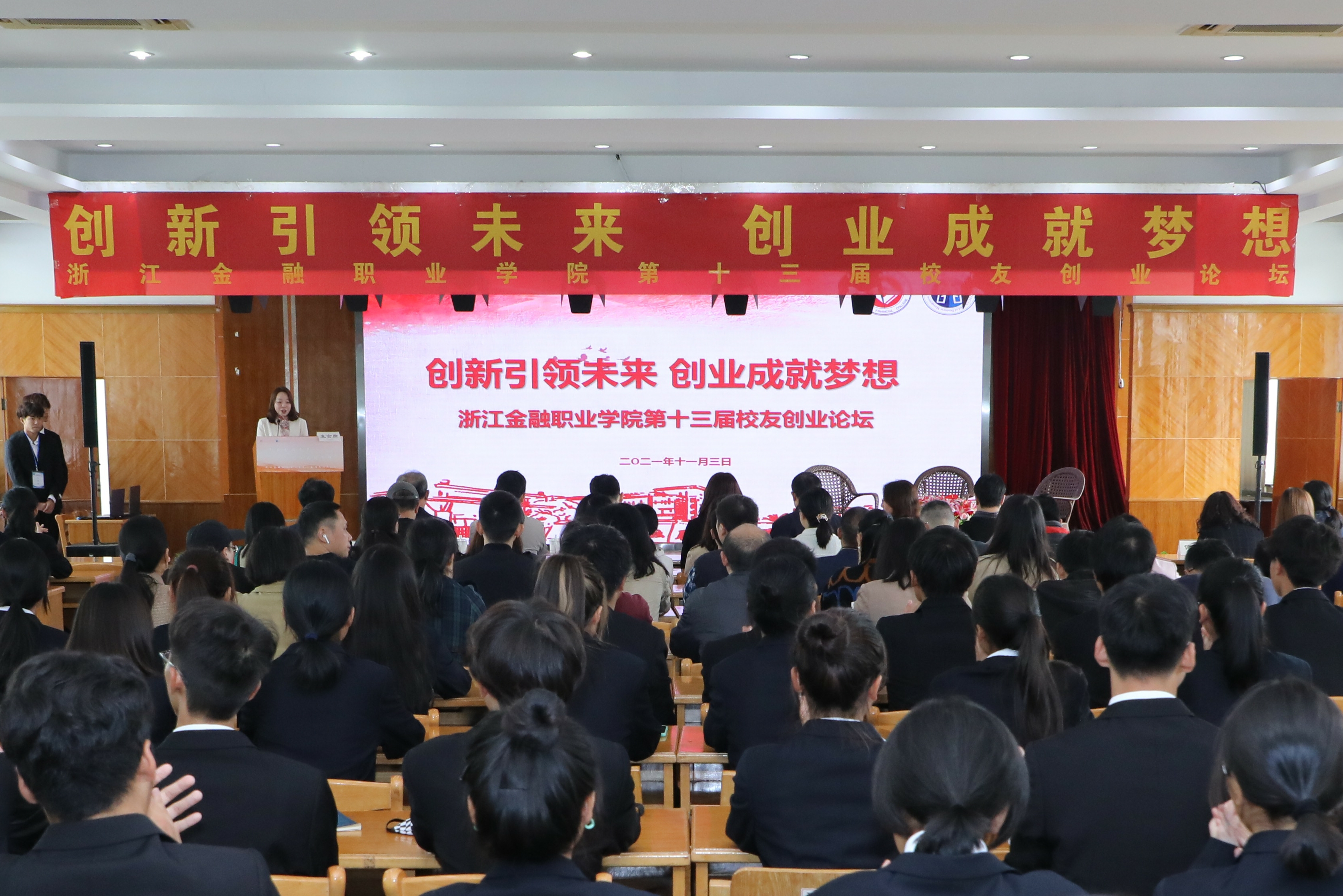 11月3日下午,由工商管理学院(创新创业学院)承办的浙江金融职业学院第十三届校友创业论坛在诚信讲学堂举行。学校校长郑亚莉,党委委员、副校长陈云涛,学校1990届校友、浙江橙马融资租赁有限公司总经理叶厉娟,2017届校友、浙江良品铺子食品有限公司人事经理汤志鹏,合作发展处、教务处相关人员、工商管理学院(创新创业学院)领导出席了本次论坛。参加本次论坛的还有工商管理学院(创新创业学院)全体教师及各分院学生代表。
