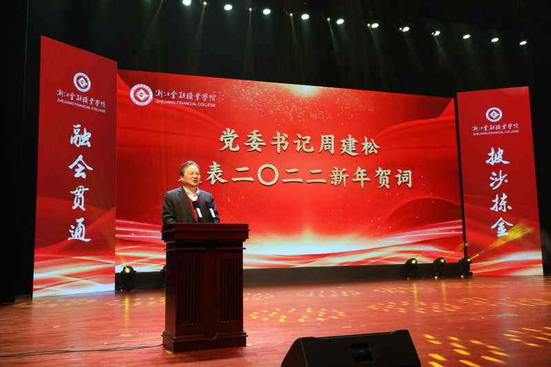 周建松发表二〇二二新年贺词。他首先代表学校党政领导班子,向全校师生致以最美好的祝愿。周书记在讲话中指出,2021年是“十四五”规划开局之年,也是中国共产党建党百年,我们国家发生了一系列重大变化。在庆祝中国共产党成立100周年大会上总书记庄严宣布我们已经全面建成小康社会,在党的十九届六中全会上总结了建党百年的奋斗历程和历史经验。中国共产党建党百年,是全中国乃至全世界的一件大事,充分彰显了中国特色社会主义、中国共产党领导的伟大力量。周书记在讲话中表示,2021年也是学校发展史上极为重要的一年,学校围绕“奋进建双高 创新赢美好”的工作理念,在党史学习教育、专业课程建设、师资队伍以及学生成长方面都迈上了新的台阶。周书记回顾总结了2021年学校在“十四五”开局之年,谋划新发展、奋力建双高进程中取得的突出成绩。他强调,要把办成育人业绩突出、社会服务领先、师资水平卓越,同时具有国内品牌和国际影响力的高水平高职学校作为“十四五”时期的奋斗目标。