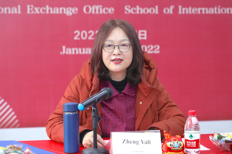 郑亚莉首先对全体留学生顺利完成一学期学业表示祝贺,并对留学生们对疫情期间校园管理工作的理解与支持表示感谢。她表示很高兴看到同学们在完成课程学习之余,积极融入浙金院大家庭,参与到学校大大小小的活动中,努力让自己在浙金院的时间过得充实而有意义,中外融通,精彩纷呈。在新春来临之际,郑亚莉校长祝愿所有同学新年快乐,并为大家送上三句新春寄语:一要提高防控意识,守护个人健康。二要培养学习习惯,提升综合素养。三要做好文化使者,促进民心相通。郑亚莉指出,近年来学校坚持推进国际化战略,加快开放办学步伐,在国际合作办学项目、学生国际交流等方面取得了长足的发展。学校十分重视留学生的教育教学,未来将继续做好各项工作,为营造良好的留学环境打下更坚实的基础。会上郑亚莉校长向与会留学生赠送了新春年味礼包和虎年吉祥物。
