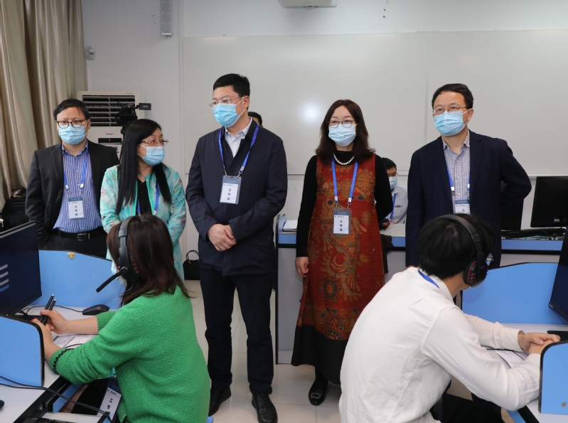 根据浙江省教育厅关于高职提前招生工作相关要求及部署,今年高职提前招生综合素质测试首次采用线上网络远程测试的形式展开。为进一步规范、稳妥做好我校2022年高职提前招生综合素质远程测试工作,4月13日上午,学校在光大教学楼6楼机房举行第三次远程测试模拟演练,学校党委书记金杨华、校长郑亚莉、副校长陈云涛深入现场,全过程视察实景模拟演练并指导相关工作,招生就业处负责人陪同视察。