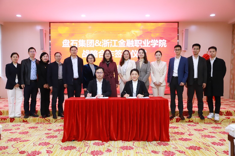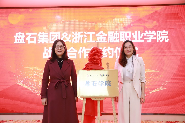4月14日,学校与盘石集团在杭州签订校企合作协议。学校校长郑亚莉,盘石集团总裁吴月凌共同见证。签约仪式上,浙江金融职业学院盘石学院正式揭牌成立。
