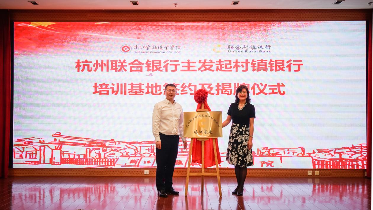 学校继续教育与培训学院和杭州联合银行村镇银行管理部相关负责人代表合作双方鉴定培训基地建设协议,方华和沈基良为培训基地揭牌。