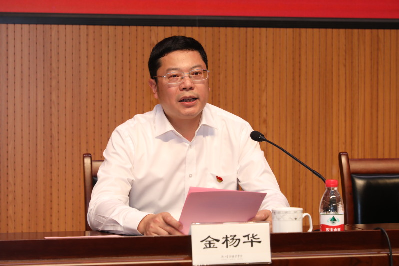 金杨华回顾了中国共产党成立101年来的伟大奋斗历程,总结了学校在历届党委行政的领导下、全校师生的共同努力下取得的跨越式发展成就,传达了中国共产党浙江省第十五次代表大会精神,并向全校各级党组织和全体党员提出三个方面要求:一是守初心担使命,时刻牢记立德树人根本任务;二是讲实干出实绩,务实推进学校发展;三是抓机遇强特色,开启职业大学建设新征程。