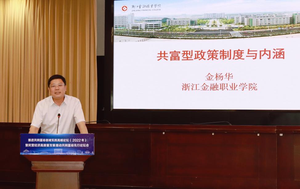 7月7日下午,推进共同富裕县域实践高峰论坛(2022年)暨民营经济高质量发展、推动共同富裕先行论坛在金华东阳举行。学校党委书记金杨华应邀作题为“共富型政策制度与内涵”的专家发言。