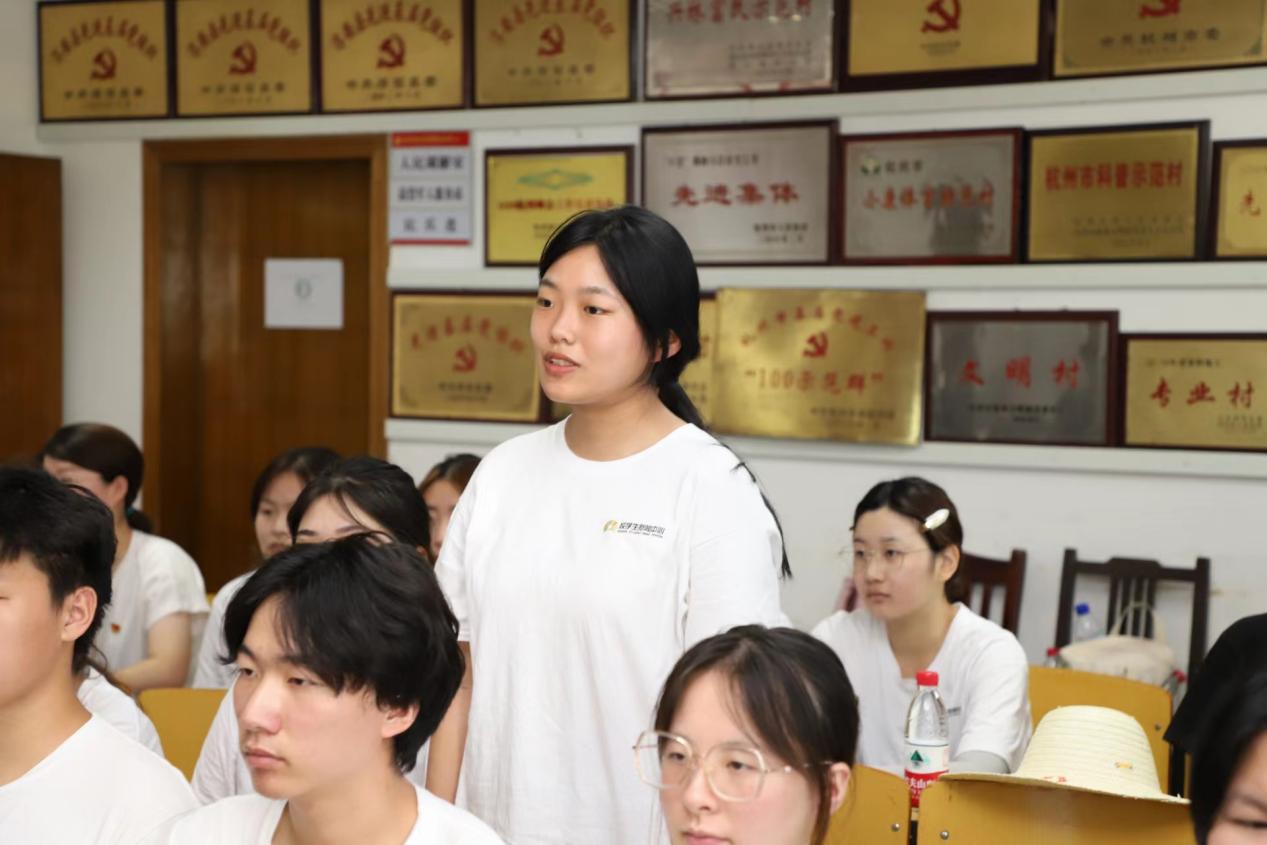 会中,金杨华还同浙江金融职业学院正在幸福村进行暑期社会实践的“校村共建 共同富裕 共享幸福”2022校学生新闻中心幸福村暑期社会实践团代表就实践内容及成果进行座谈交流。金杨华在了解实践团的大致情况后指出,实践团的学生们在实践中锻炼了自己,同时发挥自己的专业优势,围绕共同富裕为当地做出了实际贡献。