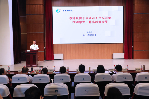 陈云涛在会上作了题为“以建设高水平职业大学为引擎 推动学生工作高质量发展”的工作报告。报告全面总结了2021-2022学年学生工作的重点、亮点,并明确新学年学生工作的四个主基调,即“抓牢学生思想政治教育的生命线”“抓实立德树人根本任务主线”“挺进学生工作‘三全育人’最前线”“守牢平安校园底线”。