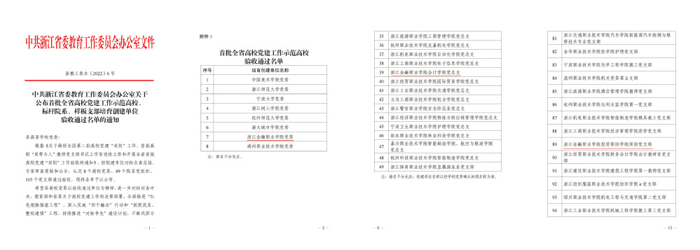 近日,中共浙江省委教育工作委员会发文公布了首批全省高校党建工作示范高校、标杆院系、样板支部培育创建单位验收通过名单,我校党委、会计学院党总支、投资保险学院保险党支部顺利通过首批全省高校党建工作示范高校、标杆院系、样板支部培育创建单位验收。