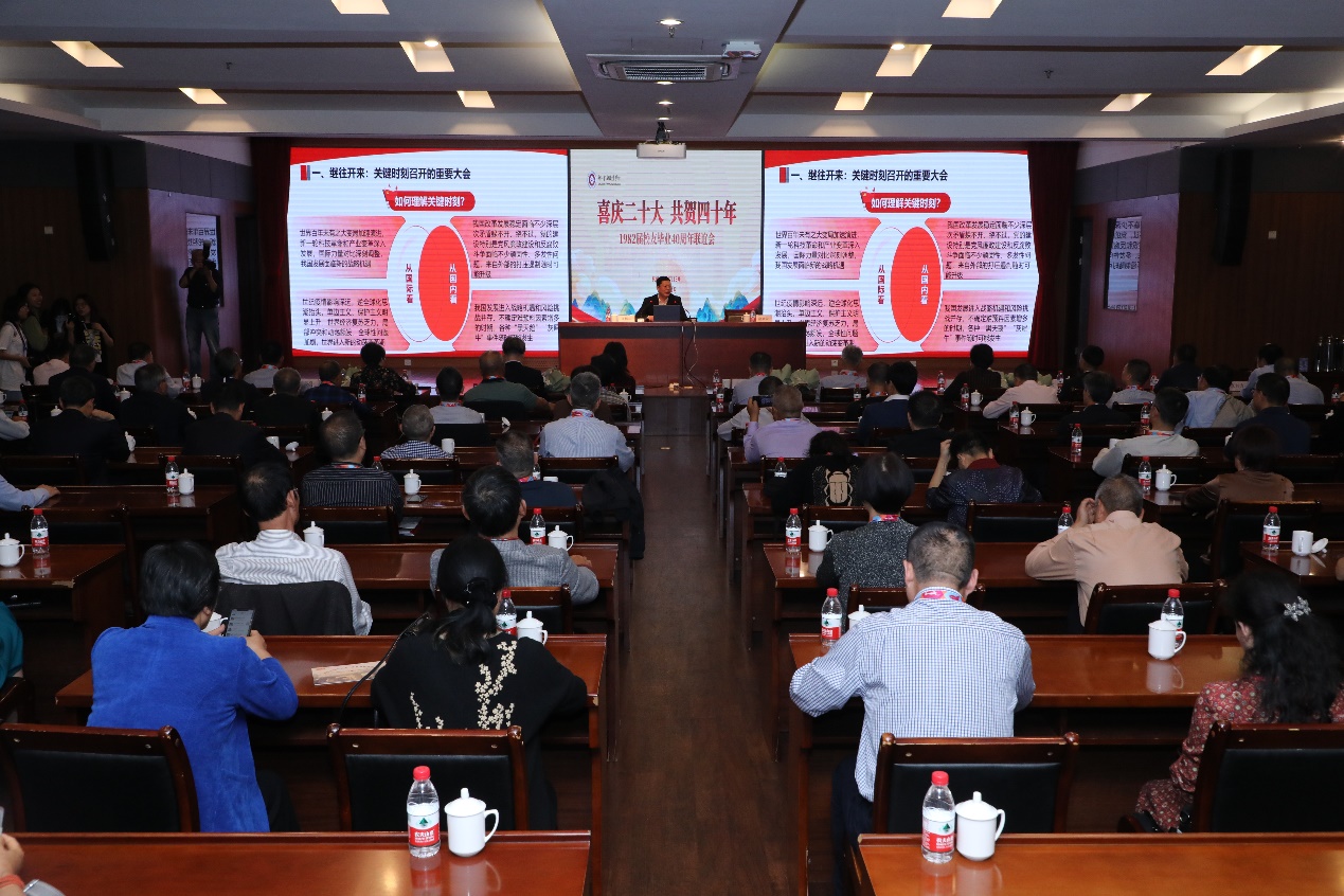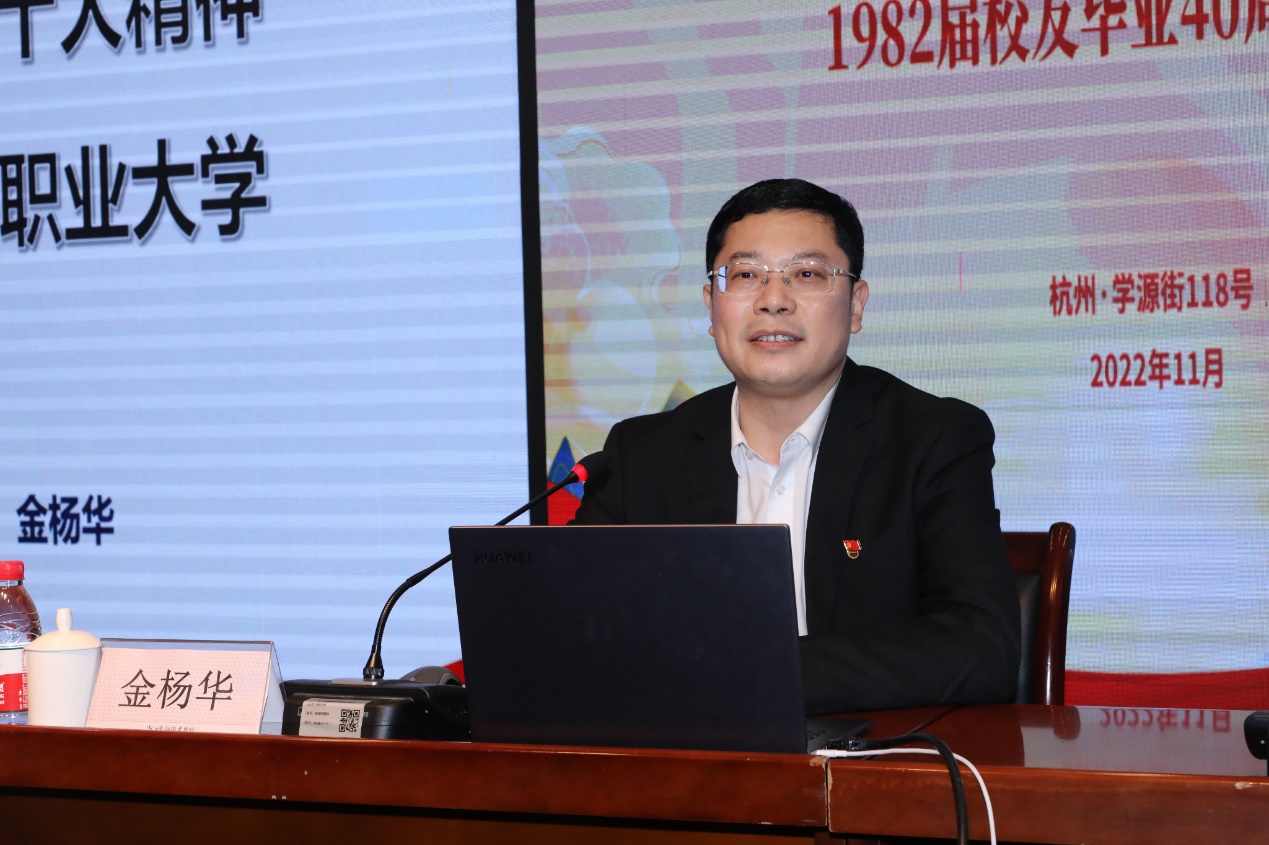 金杨华首先向回母校的1982届校友们表示热烈欢迎,并作了题为《学习宣传贯彻党的二十大精神 凝心聚力创建高水平职业大学》报告,他从继往开来、数读报告、擘画蓝图、开启新篇等方面跟校友分享学习二十大的精神体会。他向校友们介绍了学校办学概况、学校发展的历史机遇、以及学校创建高水平职业大学的目标。