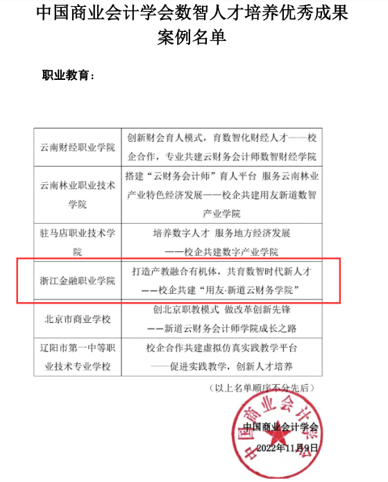 自2019年学校批准成立用友新道云财务学院以来,校企双方共同致力于数智化财务人才培养,共同组织宣传,选拔优秀学生,制定人才培养方案,校企双师型教学团队共同开展培养,第一期共有46人入选产业学院财务数字化卓越班,已经顺利毕业和就业;第二期共有35人入选,目前尚在校学习。会计学院将以此次案例入选为契机,继续推动产教融合与校企合作切实落地,深化产业学院建设,全方位培养高素质技术技能数智化会计人才,再接再厉,再创佳绩!