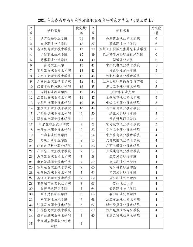 2022年12月1日出版的2022年第12期《中国高教研究》刊发题为《中国职业教育研究的前沿与进展——2021年全国高校职业教育科研论文统计分析》的文章,统计显示,我校教师2021年在高教类14种和职教类4种中文核心期刊发表教育科学研究论文21篇,发表量位列全国高职院校第一。与此同时,2019-2021年我校教师在上述期刊发表教育科学研究论文74篇,位列连续3年活跃研究机构的公办高职高专院校榜首。