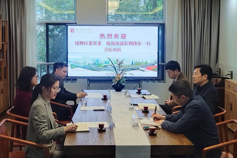 周伟东对学校办学特色、办学成效给予高度肯定,对学校长期以来支持钱塘区统战工作特别是对区校统战融合方面的大力支持表示衷心感谢,详细介绍了钱塘区的统战工作、推进区校统战融合的进展情况以及取得的成效。他指出,学校办学特色鲜明,有资源,基础好,希望学校能积极发挥独特的资源优势,进一步加强区校统战联动,共同探索路径促进产教深度融合,打响地校企统战合作品牌,助推地方经济高质量发展。他表示,钱塘区委统战部也将以此次走访为契机,落实中共中央办公厅、国务院办公厅印发的《关于深化现代职业教育体系建设改革的意见》文件精神,推进钱塘区中华职教社筹建工作。