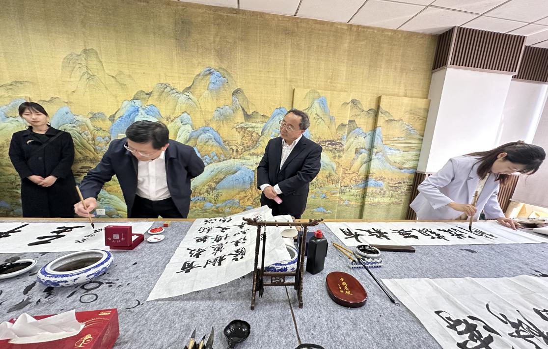 开幕式后,各位领导嘉宾来到校图书馆二楼经典书馆进行书道茶语交流会。期间张江琳与绍兴兰亭青年书法家、我校书法协会师生共同泼墨挥毫,饶有兴致地作“群贤毕至”,“有教无类,滋兰树慧”题字,重温先贤雅集,感受千年前的翰墨飘香、丹青溢彩。