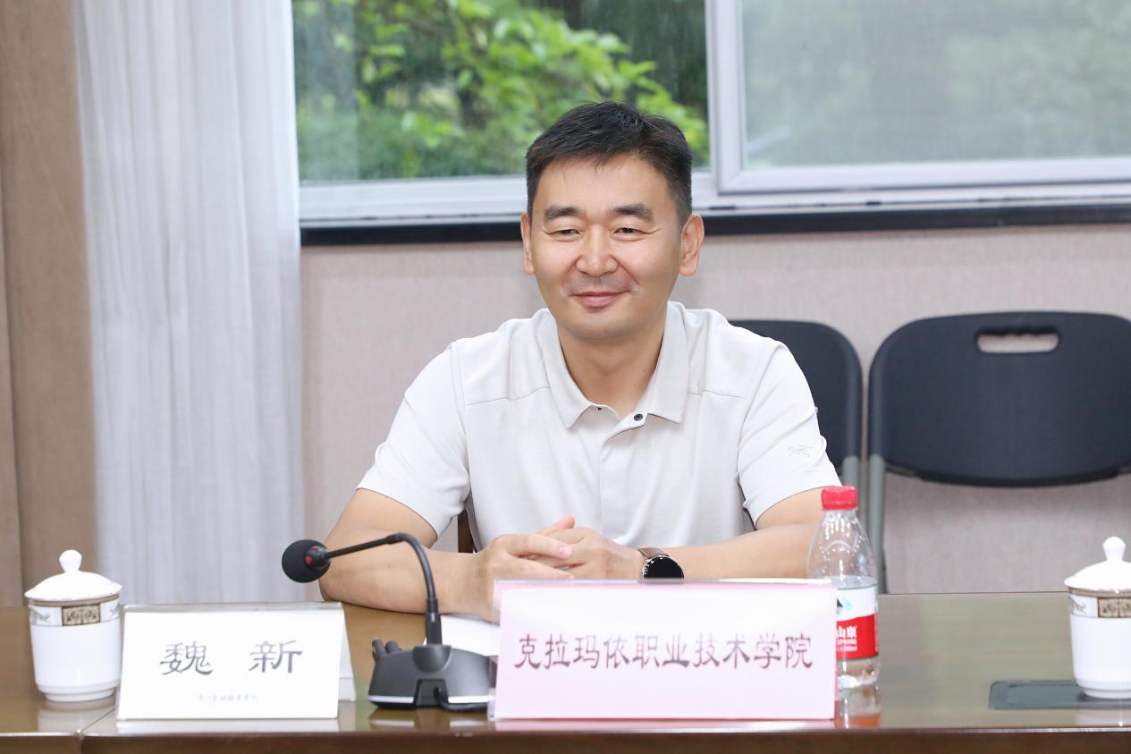 魏新高度赞扬我校的办学特色和办学成果并简要介绍克拉玛依职业技术学院的基本情况。魏新表示希望能持续深化校际交流,加强合作,共谋发展。