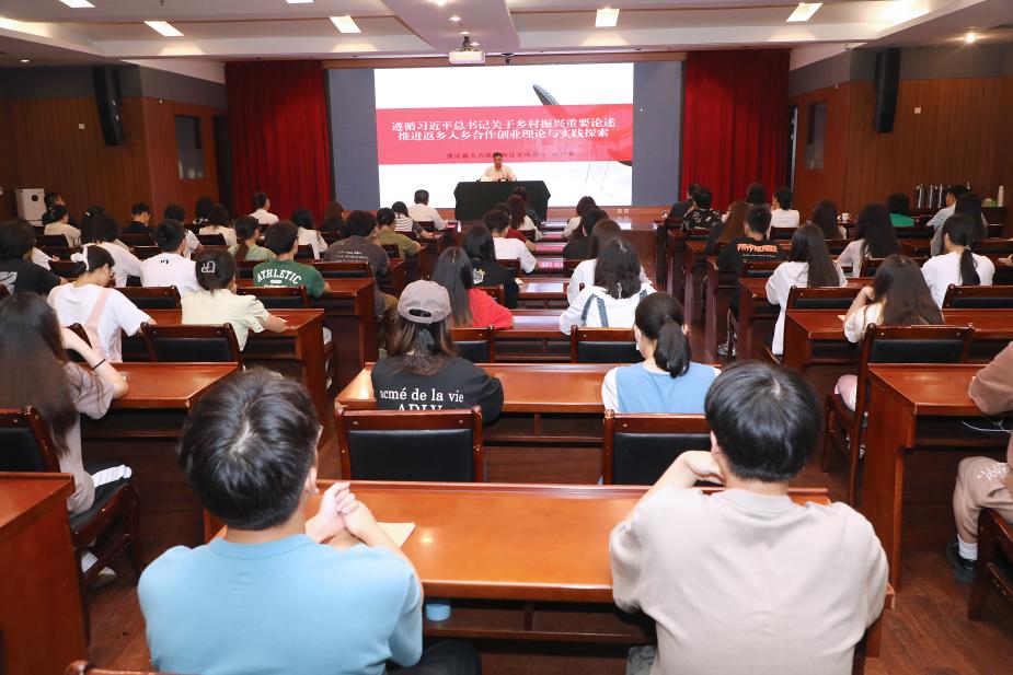 金林贵副厅长以《遵循习近平总书记关于乡村振兴重要论述 推进返乡入乡合作创业理论与实践探索》为题,为现场师生展开详细论述。他从返乡创业大学生优秀成功案例引入,引起全场同学共鸣,让广大青年学生真正认识到基层农村广阔天地大有可为。紧接着他系统讲述了习近平总书记关于乡村振兴重要论述精神,他强调,推进返乡入乡合作创业是全面建设中国式现代化、全面推进共同富裕和全面推进乡村振兴的迫切需要,有着深厚的理论支撑。他指出,当前在推进返乡入乡合作创业的实践过程中主要存在青年大学生返乡入乡创业意愿不强、部分创业项目质量不高、返乡入乡创业没有形成适度规模以及组织化程度不高等四个问题。针对存在的问题,他认为应该坚持系统观念,通过创业链和企业链双链融合,运用“1+3+N(n)”返乡入乡合作创业组织模式进行破解,并围绕模式的组成、内涵、意义、前提、发展方向等方面,对模式作了系统详尽的阐述。最后,他希望在场青年大学生勇担使命,不负韶华,为乡村振兴和共同富裕事业贡献青春力量。