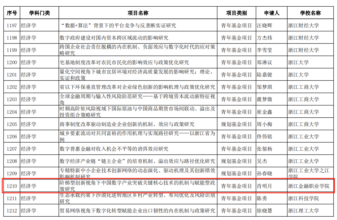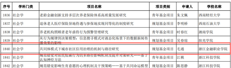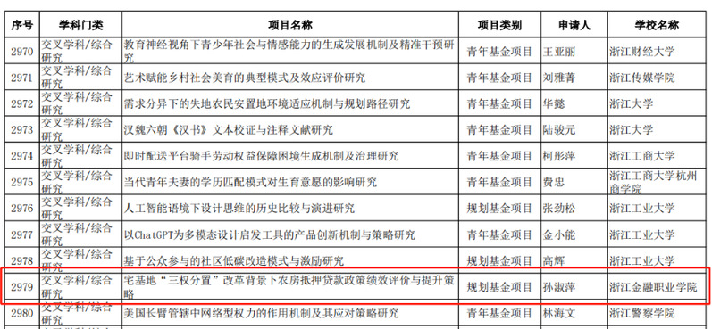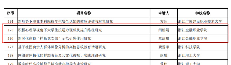 近日教育部公示了“2023年度教育部人文社会科学研究一般项目评审结果”,我校《阶梯型创新视角下中国数字产业突破关键核心技术的机制与赋能型政策研究》《“双循环”视角下数字赋能职业教育国际品牌建设的内在机理、模型构建和实现路径》入选青年基金项目,《共同体模式下城市社区信用治理的机制与路径研究》《宅基地“三权分置”改革背景下农房抵押贷款政策绩效评价与提升策略》入选规划基金项目,《积极心理学视角下大学生抗逆力现状及提升路径研究》《新时代高校“样板党支部”示范引领作用研究》入选专项任务项目(高校辅导员研究)。我校共6个项目入选,实现我校入选该项目数量的新突破,入选数量更是位居全国高职院校首位。