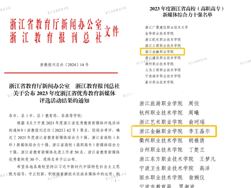 近日,浙江省教育厅新闻办公室、浙江教育报刊总社公布了2023年度浙江省优秀教育新媒体评选活动结果,学校荣获“2023年度浙江省高校(高职高专)新媒体综合力十强”称号,取得历史性突破!学校教师李王晶尔获“2023年度浙江教育新媒体先进工作者”称号。