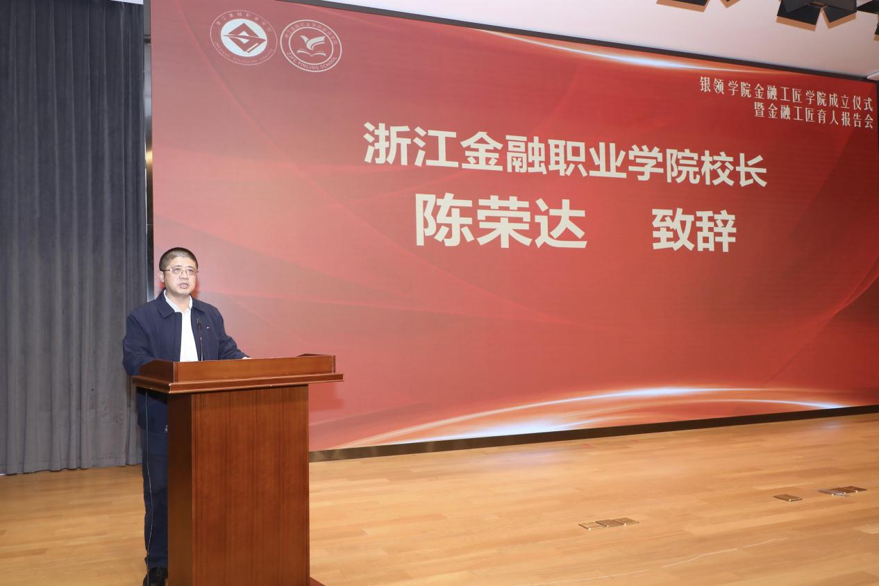 陈荣达在致辞中指出,金融工匠学院的成立,是学校服务中国式现代化、积极响应国家大力发展现代金融体系战略的重要举措。金融工匠学院将立足三大定位:一是建设服务中国式现代化金融体系的育人新平台,通过整合行业资源与教育优势,培养和输送更多“用得上、留得住、发展好”的高素质技能型金融工匠人才;二是构建产教融合新生态,通过校企协同育人机制,实现“教学与实战融合、课堂与岗位贯通”,形成“共育、共管、共享”的长效机制;三是点燃匠心传承之火,激励青年学子在学习技艺的同时悟道修身,将爱岗敬业、精益求精、守正创新的职业信念内化于心、外化于行。他强调,金融行业不仅需要科技与制度创新,更需要一批以恒心筑梦、以专注成事的实干型金融工匠。希望青年学子锤炼匠心、精进技能,为金融行业高质量发展注入新动能。