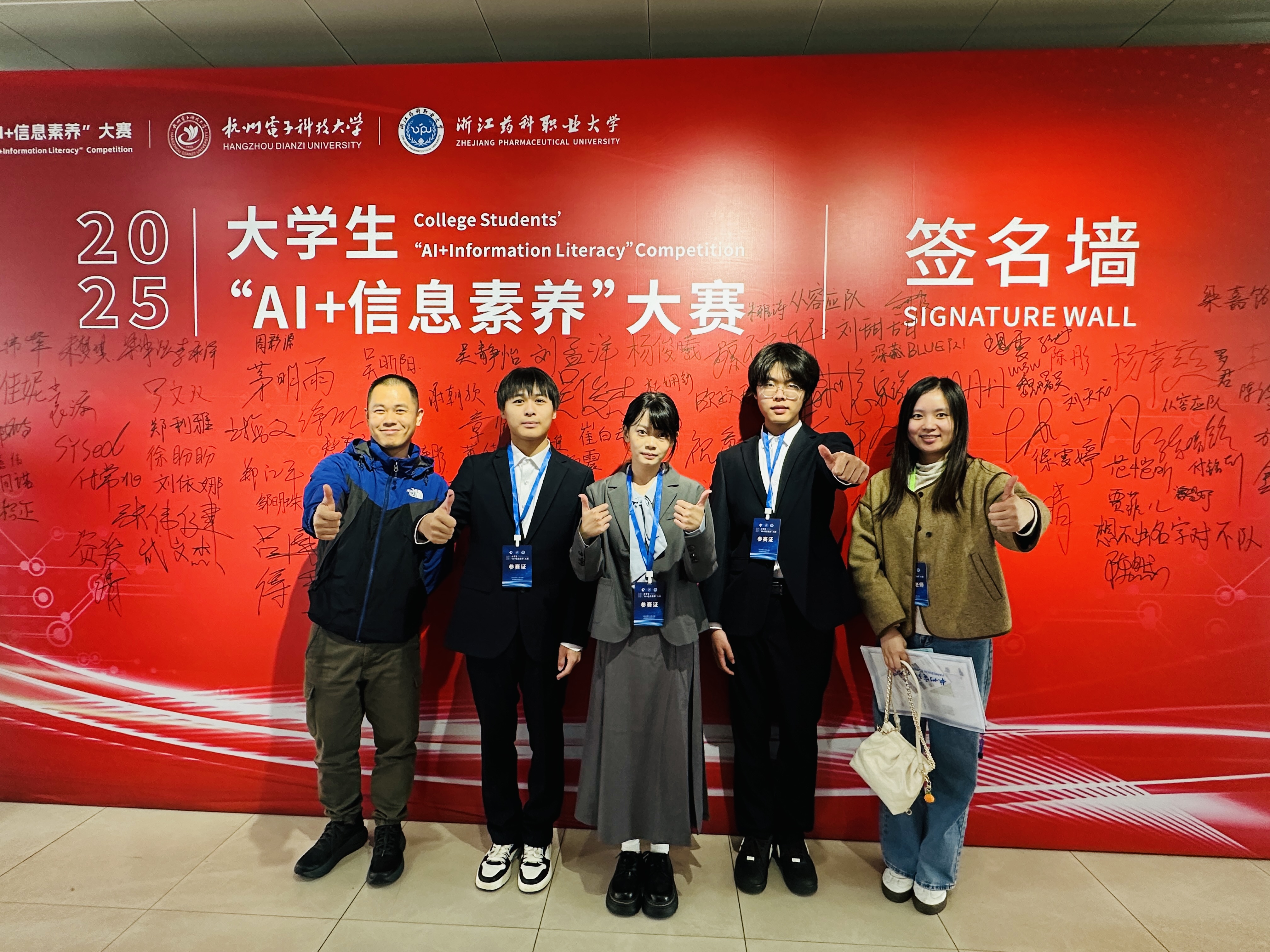 近日,由浙江省高等学校图书情报工作指导委员会主办的浙江省大学生“AI+信息素养”大赛暨2025年大学生“AI+信息素养”浙江赛区决赛在杭州电子科技大学落下帷幕。我校信息技术学院数媒241范恺昕,国际商学院跨境242罗君、付铭轩等3位同学组成的“从容应队”历经校园选拔赛、全省淘汰赛,从全省11717名同学中突出重围,最终在决赛中从容应答,荣获二等奖,陈君、孙文娉2位教师获“优秀指导教师”奖。