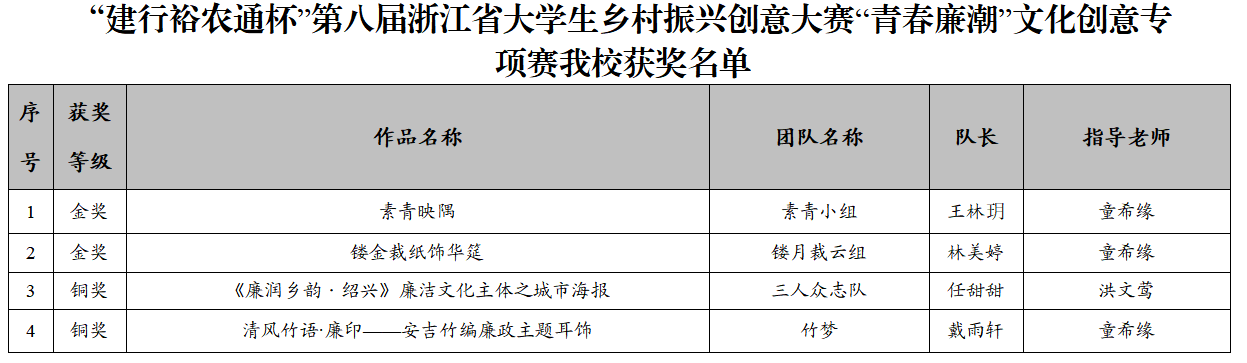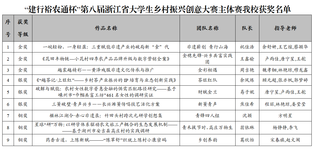 近日,“建行裕农通杯”第八届浙江省大学生乡村振兴创意大赛圆满落下帷幕,我校参赛团队荣获金奖5项、银奖3项、铜奖5项的好成绩,实现在该赛项的历史性突破。