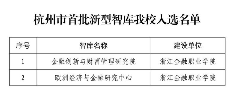 近日,杭州市哲学社会科学规划领导小组发文公布了杭州市首批新型智库遴选结果,我校金融创新与财富管理研究院、欧洲经济与金融研究中心均获杭州市首批新型重点专业智库立项,是全省高职院校中唯一入选首批新型重点专业智库的院校。
