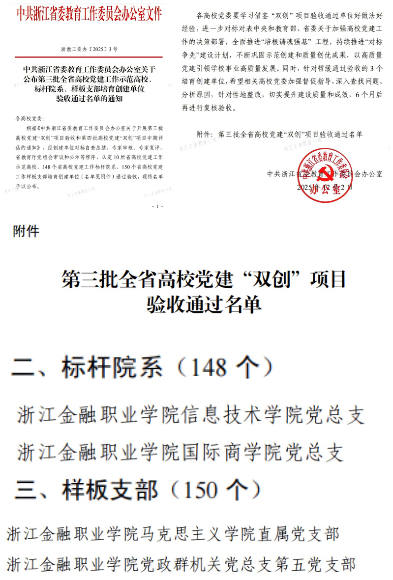 近日,中共浙江省委教育工作委员会发文公布了第三批全省高校党建工作“双创”项目验收通过名单,我校国际商学院党总支、信息技术学院党总支顺利通过第三批全省高校党建工作标杆院系培育创建单位验收,马克思主义学院直属党支部、党政群机关党总支第五党支部顺利通过第三批全省高校党建工作样板支部培育创建单位验收。