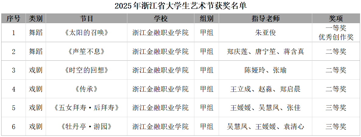 近日,2025年浙江省大学生艺术节圆满落下帷幕,我校在本次艺术节表现亮眼,荣获一等奖1项,二等奖3项,三等奖2项,学校再次荣获“优秀组织奖”。