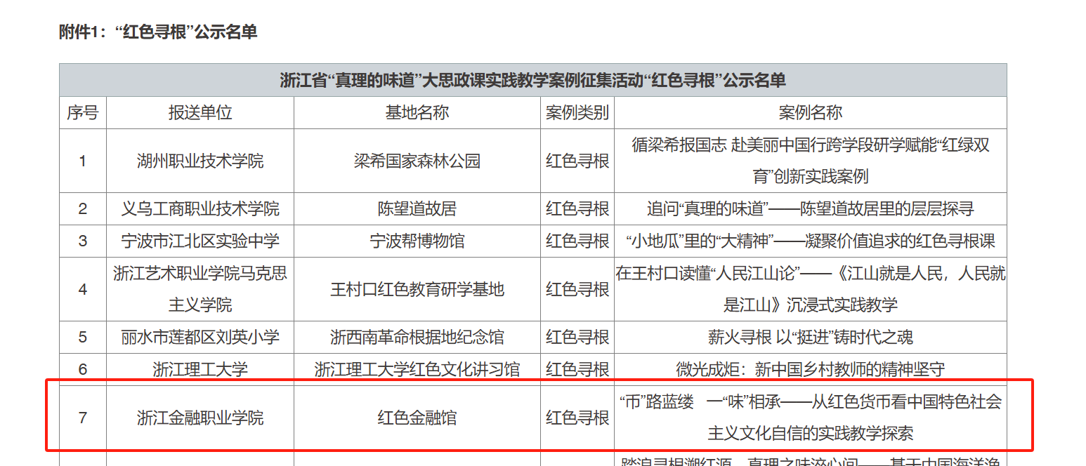 近日,浙江省“真理的味道”大思政课实践教学案例立项结果正式公布,我校申报的案例成功入选。该案例以“红色货币”为独特载体,以“真理的味道”为精神主线,以“文化自信”为价值内核,融合国家级教学成果与校本红色金融馆资源,构建了一堂具有鲜明特色和实践深度的“大思政课”。