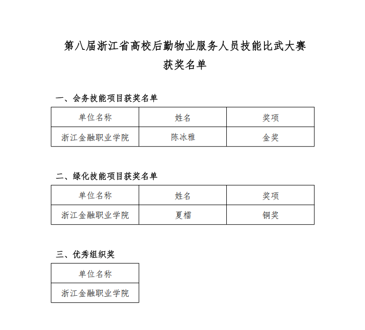 近日,第八届“浙江省高校后勤物业服务人员技能比武大赛”在我校绍兴校区圆满落幕。经过激烈角逐,我校物业服务团队凭借精湛的专业技能和出色的现场表现,在全省众多高校代表队中脱颖而出,一举斩获会务技能项目金奖、绿化技能项目铜奖。此外,学校还荣获大赛优秀组织奖。