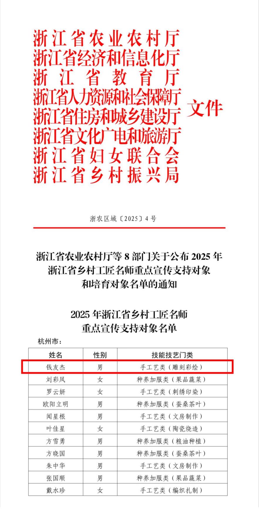近日,浙江省农业农村厅等8部门联合公布2025年浙江省乡村工匠名师重点宣传支持对象名单。我校教师、“浙江工匠”钱友杰凭借深厚技艺、丰硕传承成果与突出社会贡献,从千名省级培育对象中脱颖而出,成为全省75名获此殊荣者之一。这份荣誉,既是对其个人匠心的肯定,更彰显了我校在传统手工艺人才培养与非遗文化传承领域的硬实力。