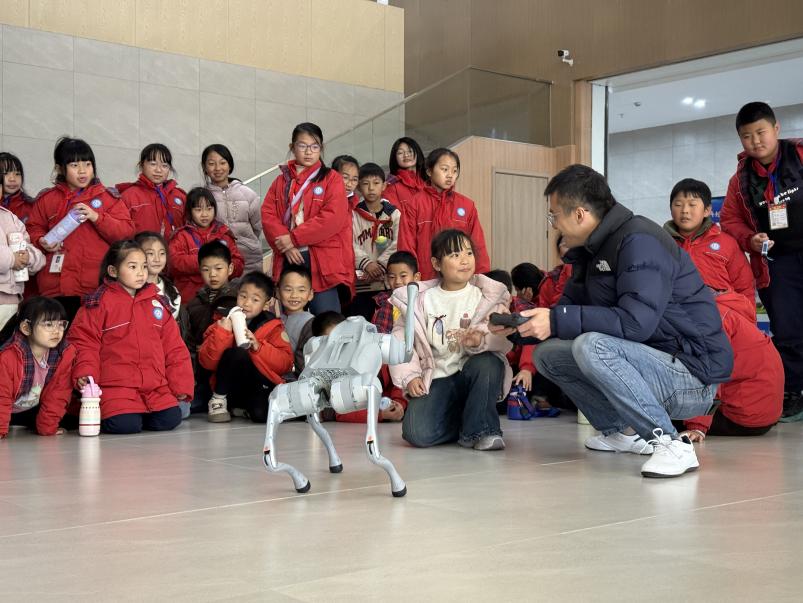 盖北镇中心小学是一所多民族学生融合的学校,孩子们如“石榴籽”般紧密相聚,共同成长。为了让少数民族学生近距离感受国家科技发展与职业教育的魅力,学校精心设计了科技体验与金融实践相结合的活动内容。走进图书馆,学生们先体验了智慧借阅系统。而在图书馆一楼一只灵动的机器狗瞬间成为了全场的焦点。它流畅完成行走、跳跃、奔跑、握手乃至“献爱心”等动作,引得孩子们时而惊呼、时而欢笑,在科技的奇幻世界中感受到先进生产力的鲜活脉动。