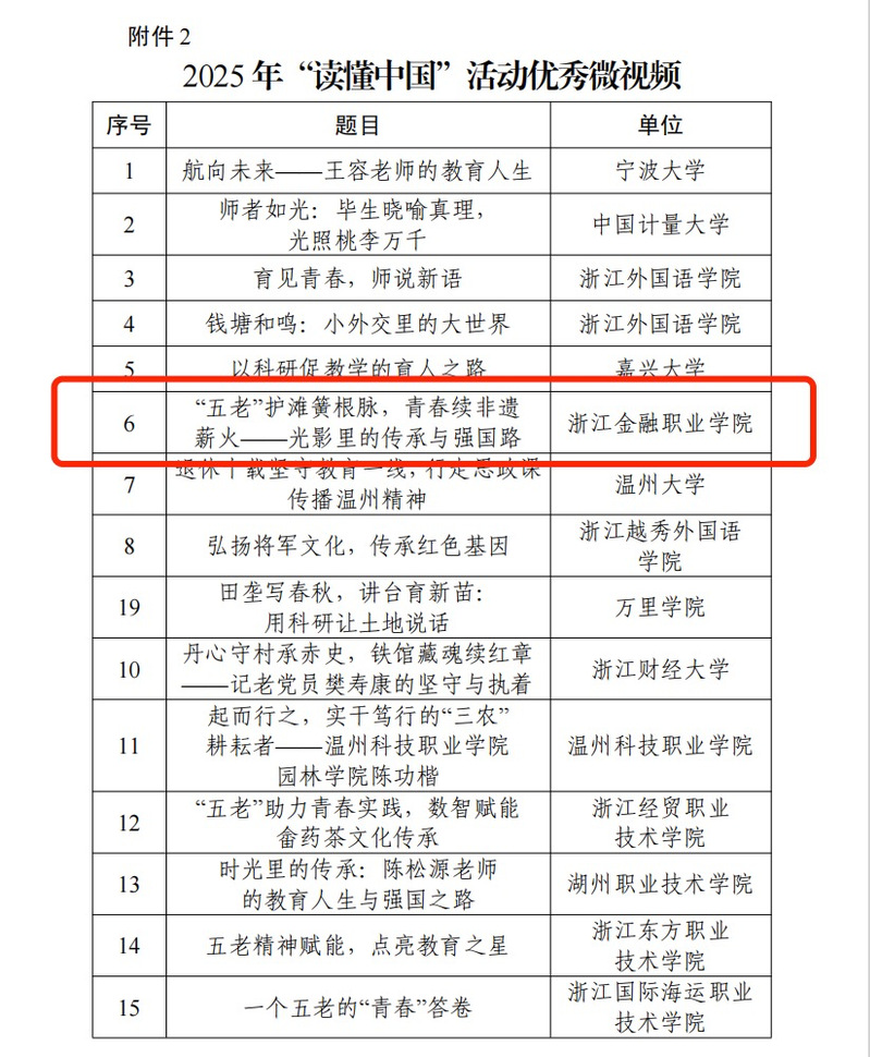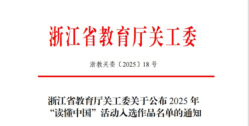 近日,浙江省教育厅关工委公布2025年“读懂中国”活动入选作品名单,我校师生作品《“五老”护滩簧根脉,青春续非遗薪火——光影里的传承与强国路》成功入选2025年“读懂中国”活动优秀微视频,充分展现我校青年学子对“五老”精神的理解与传承,展现助力文化强国建设的青春担当。