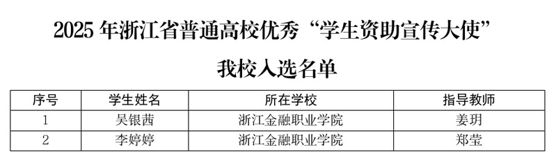 在2025年浙江省普通高校优秀“学生资助宣传大使”资助育人实践活动评选中,我校2名同学成功入选2025年浙江省普通高校优秀“学生资助宣传大使”。