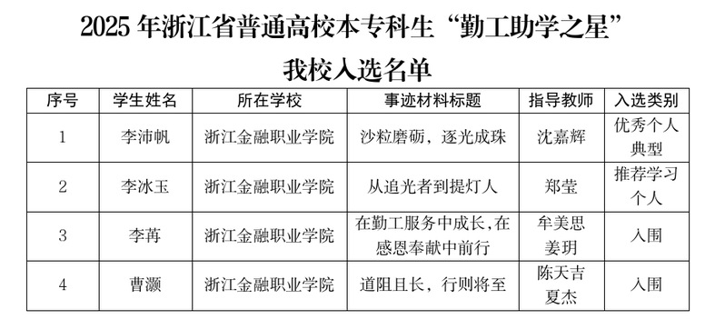 近日,浙江省学生资助管理中心公布了2025年普通高校“勤工助学之星”“三助一辅之星”、“学生资助宣传大使”活动系列评选结果,我校学子凭借优异表现斩获多项荣誉,充分彰显了我校资助育人工作的扎实成效。