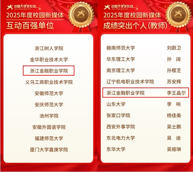 近日,教育部中国大学生在线公布了2025年度校园新媒体表彰名单。我校凭借扎实的工作和突出的表现,斩获两项荣誉,充分展现了学校网络思政工作的活力与成效。在集体项目中,学校入选2025年度校园新媒体“互动百强单位”;在个人项目中,学校教师荣获“成绩突出个人(教师)”。