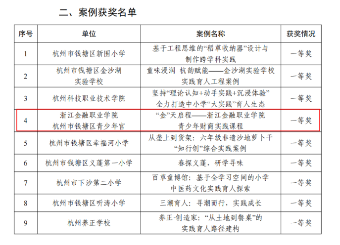 近日,由杭州市钱塘区教育局主办的中小学“大实践”育人工程教学(活动)案例评比落下帷幕。在全区百余个参评案例中,由我校投资保险学院牵头,联合钱塘区青少年宫报送的《“金”天启程——浙江金融职业学院青少年财商实践课程》案例荣获一等奖,我校还获优秀组织奖。