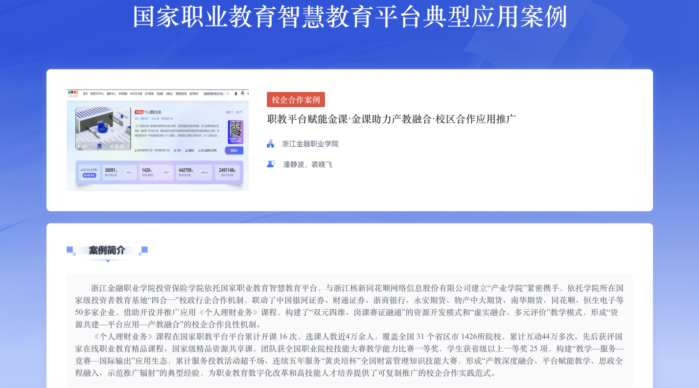 近日,2025年国家职业教育智慧教育平台典型应用案例正式公布,我校《职教平台赋能金课·金课助力产教融合·校区合作应用推广》案例成功入选“校企合作”类典型应用案例,并在国家平台进行展示推广。该案例由投资保险学院潘静波、裘晓飞领衔的个人理财团队申报。